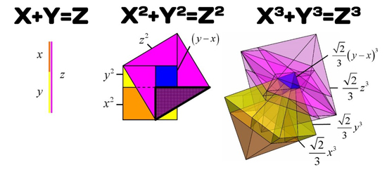 The right-hand side of the theorem is rotated by 90 degrees and the blue square transforms into a blue octahedron. For those who do not know, an octahedron is the 3D equivalent of a square. This implies that while the 2D proof is based on squares, the 3D proof relies on octahedrons. One can spot the presence of 2D theorem by understanding that right-angle triangle (shaded) is present. The 3D variables are in fact governed by the 2D. The detailed explanations can be found in Teia’s book, X3+Y3=Z3: The Proof.