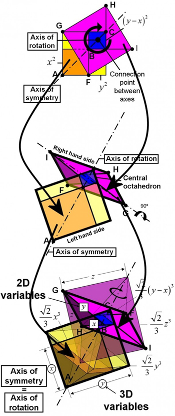 The right-hand side of the theorem is rotated by 90 degrees and the blue square transforms into a blue octahedron. For those who do not know, an octahedron is the 3D equivalent of a square. This implies that while the 2D proof is based on squares, the 3D proof relies on octahedrons. One can spot the presence of 2D theorem by understanding that right-angle triangle (shaded) is present. The 3D variables are in fact governed by the 2D. The detailed explanations can be found in Teia’s book, X3+Y3=Z3: The Proof.