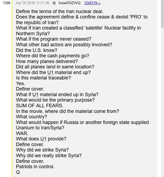 QAnon is telling us that the chemical weapons justification used by President Trump to authorize the strike was a charade, a cover. The US military was really targeting the secret nuclear facilities ostensibly controlled by Iran, but were in fact Deep State assets.