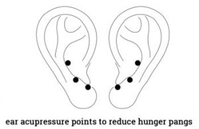 To suppress hunger pangs, press the points shown on the ear diagram. Place the middle finger on the front of each ear and the thumb on the back of each ear. Press these points for five minutes in total, thirty minutes before eating.