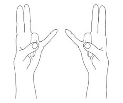 To practice, bend your ring fingers inwards. Place the tip of your thumbs on the outside edge of the middle joints of your ring fingers. Relax and extend your index, middle, and little fingers. Practice two times a day for thirty minutes in total.