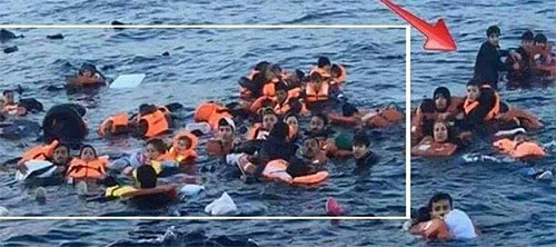 In this case the mainstream media cropped a photo to remove the man standing in shallow water. In the cropped context the Muslim ‘refugees’ appear to be drowning helplessly at sea!