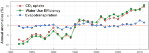 Changes in global terrestrial uptake of carbon dioxide, water use efficiency and ecosystem evapotranspiration during 1982-2011. Source.