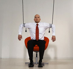 SM: (he sits on the chair in front of the desk, he imitates unnoticeably the voice tone and the other’s way of standing) I understood that the ZKM computers sales go very well…
