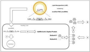 To protect against destruction by the immune system, modRNA is packaged in lipid nanoparticles (LNPs) that, due to their small size and synthetic optimization, can easily overcome biological barriers and even reach vital cells in the heart and brain.