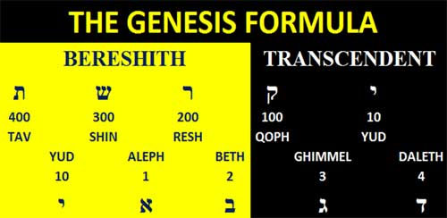 This is why YUD is seen at both ends of the spectrum of the Genesis Formula. The powers that be must parade before him. In the above illustration I have only gone out to Daleth because the mathematical pattern on the TRANSCENDENT side would theoretically have to mimic the one ending with TAV on the BERESHITH side: ‘as below so above or as above so below’, in order to meet the criteria laid out in the second day of creation: ‘waters above the heavens and the waters beneath the heavens’.