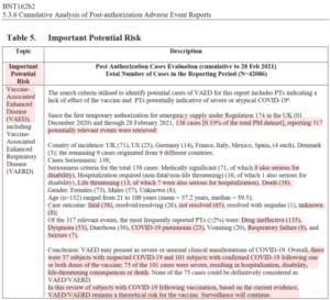 One of the documents contained in the latest data dump is reissue_5.3.6 postmarketing experience.pdf. Table 5, found on page 11 of the document shows an ‘Important Potential Risk’, and that risk is listed as ‘Vaccine-Associated Enhanced Disease (VAED), including Vaccine-Associated Enhanced Reporatory Disease (VAERD)’.