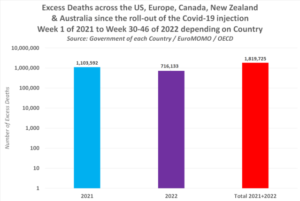 Official reports published by the Governments of the USA, Canada, Australia, New Zealand, the UK & most of Europe, confirm 1.8 million excess deaths have been recorded since the mass roll-out of the covid-19 injections.