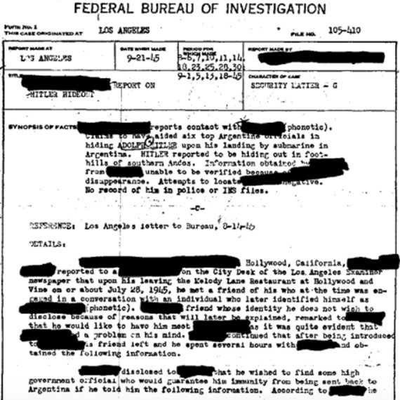 It outlines knowledge of Hitler escaping via boat and landing in Argentina where it is believe he spent his remaining days here on Earth.