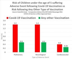 Even worse, 1.43 percent of every 100 kids that get the mRNA jab suffer from blood-related (pulmonary) injuries to the lungs, blood vessels, and airways. This means the risk of children under 5 suffering illness of the pulmonary system is 204 percent higher following Fauci Flu jabs than it is following any other vaccination ever created. The results also show the same risk is involved for kids regarding neurological disorders from the mRNA stabs – causing illnesses of the brain and nerves.
