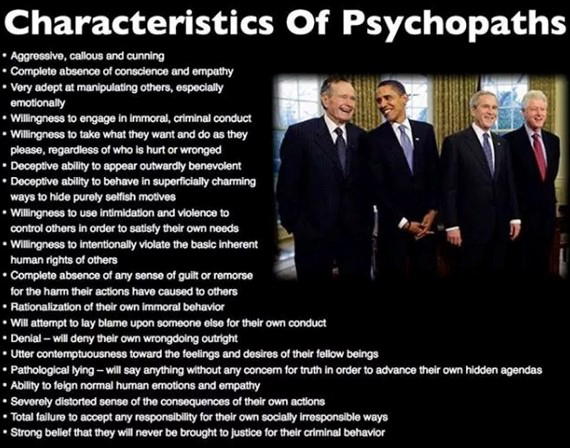 Bottom Line: A psychopath will do and/or say anything to get what they want. Conversely, upright human beings usually attempt to follow the golden rule. Hence, a cabal of psychopaths has an infinite number ploys and plots by which to project their power and gain further ascendancy within the realm. Given this chasm between their respective behavioural patterns, is it any wonder that psychopaths rule the world in 2018?” – SOTN’s Resident Expert on Psychopathy.