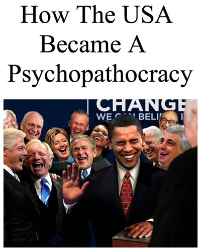 The best way to truly apprehend the cause of the decline of this once great nation is to understand the deliberate, stealthy and slow-motion “ponerization” of the US government, Corporate America and civil society. The following exposé clearly spells out how this profoundly conspiratorial process took place over many decades: PONERIZATION: How the American Republic was taken over by political cliques of criminally insane psychopaths.