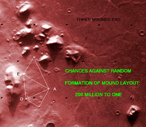 McDaniel and Sirisena reinforce the strange configuration by comparing three datasets. The resolution of the ESA 2006 photos is 13.7 meters per pixel and that of NASA’s MRO HiRise 2014 images is 5 meters per pixel. This is compared to the original 47m per pixel Viking shots. Presented below are the mounds from all three spacecraft, showing clearly the parallel lines and right-angled triangles formed by their layout. Is there a message implicit in this ground plan?