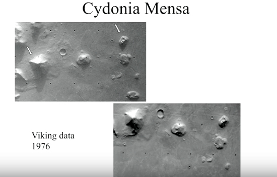 “Someone complained to me: John, why do you have to bring Cydonia into this? And I said: because I can read a map. Here’s what’s at Cydonia Mensa. There’s the face on Mars, there’s the D & M pyramid. Here it is in a second shot, this was taken July 25th, this was taken 30 days later, the US government was apparently doing a follow-up investigation. These two pictures [that we presented above – e.n.] tell you everything you need to know about what’s at Cydonia Mensa (region of Mars). If you see on a planet that used to be Earth-like, a carved human face and a pyramid within 5 km of each other it doesn’t take a rocket scientist to figure out what this all means, you can connect the dots. I mean sometimes, and I can tell you as a scientist and I’ve seen other scientists do this, if you’re cornered, you’re just brazing it out, you hold up a picture of a buffalo and insist that it’s a dog.”