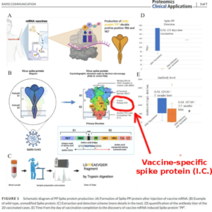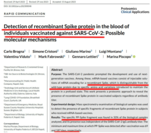 “Experimental design: Mass spectrometry examination of biological samples was used to detect the presence of specific fragments of recombinant Spike protein in subjects who received mRNA-based vaccines.”