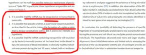 An item of note is the above sentence, “It is possible that the mRNA may be integrated or re-transcribed in some cells”. The so-called reverse transcription, that is, vaccine mRNA becoming part of the human DNA genome in some affected cells, was originally dismissed without evidence by the so-called ‘Covid science’, until it was demonstrated in in-vitro experiments.
