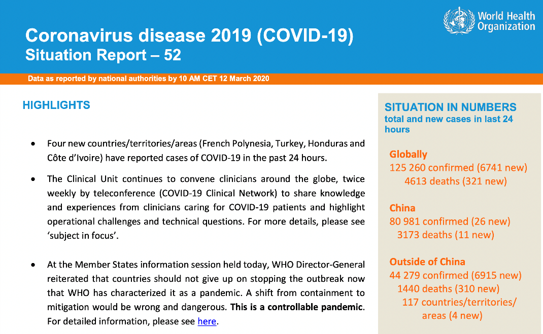The number of confirmed cases outside China (6.4 billion population) was of the order of 44,279 and 1,440 deaths (figures recorded by the WHO for March 11 and March 12).