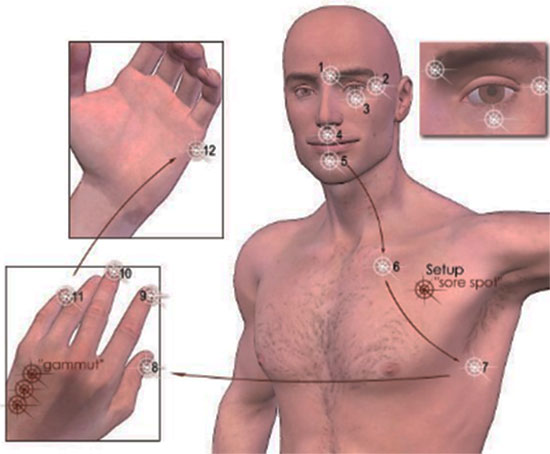 Find a peaceful place where you can take a few minutes to breath and let go. Begin by accepting that you have a problem, symptom or painful memory you would like to resolve. Then tap specific points on the body as indicated in the image below. You should tap sharply, but not hard enough to cause any discomfort – about 5-10 times on each meridian point, while focusing on the problem /memory /symptom you would like to clear.
