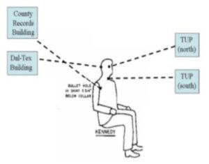 If you put together the two hits agreed upon by the Secret Service and the FBI–which were supposed to have been fired from the 6th floor of the Texas School Book Depository but were actually fired from the top of the County Records Building (in the case of the shot to the back) and from the 2nd floor of the Dal-Tex Building (in the case of the shot to the EOP)–with the shots to the throat (fired from inside the Triple Underpass) and to the right temple (from an above sewer opening at the intersection of the Triple Underpass and the picket fence), there were inescapably four.