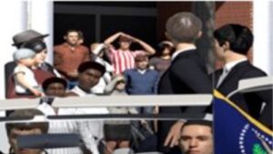 Notice other obvious indications of alternation, where “Black Tie Man” is both in front of and behind “Doorman” at the same time, which is an optical impossibility–and by itself proves the photograph was altered.