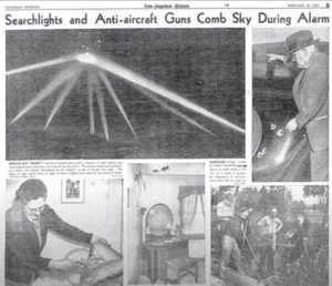 A few weeks later, in February 1942, the government released a large number of weather balloons over Los Angeles. The appearance of these balloons caused great alarm among the people. They went along with air raid sirens, scenes of searchlights illuminating the night skies over Southern California and the blare of anti-aircraft fire shooting at “unidentified flying objects.”