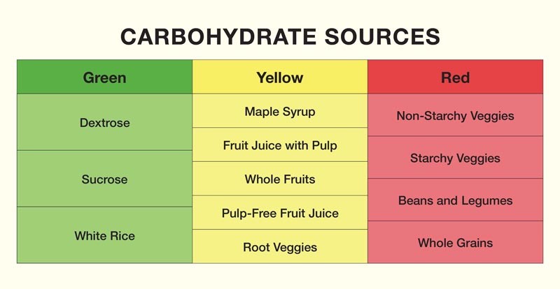 The table below breaks down different types of carbohydrate sources and how they fit into this plan. We can divide them into three groups: green, yellow and red.
