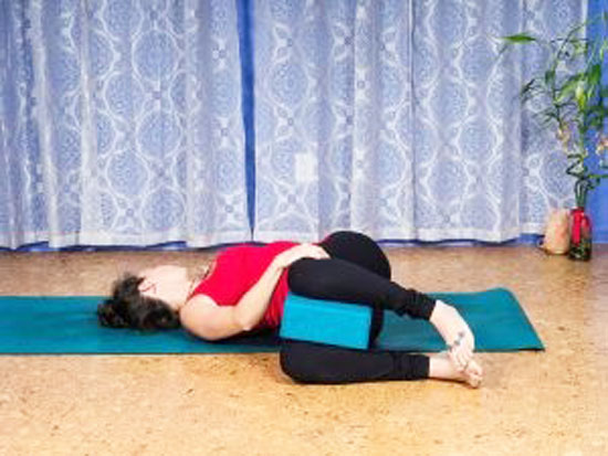 Lay flat on the ground with legs bent. Place feet flat on the ground, and hold a block between the knees. Lay arms out in a T position. Take bent knees over to one side. Place another block, bolster or folded blanket underneath the knees if they do not rest comfortably to the ground. Turn head away from the knees. Hold 5-10 minutes, breathing mindfully. Then, repeat on the other side.