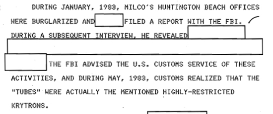 According to Milchan’s heavily-redacted FBI file details, in January 1983 there was a break-in at MILCO’s offices in Huntingdon Beach and someone (likely Smyth) filed a report with the FBI. Presumably the burglars stole some of the krytrons because when the Bureau interviewed the person who filed the report he mentioned “tubes”, which Customs quickly figured out were krytrons.