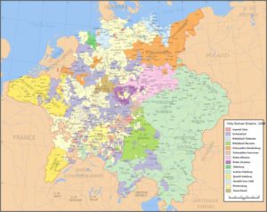 Unlike today’s Germany, the land that blew up in religious conflict during these dark years was dominated by small-brained warlord Princes and Dukes whose power was contingent on how many mercenaries they could hire and land they could steal. In total, over 350 tiny states and principalities existed along with 2000 jurisdictions which divided the Holy Roman Empire under an array of mini sovereignties with no conception of a greater whole. [see map]