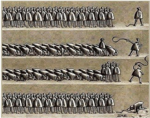 Humans appear to be driven by a variety of factors, from needs and desires, to love and fear. Some people are more willing to concede whatever is asked of them while others are not. The problem lies not in the laws and directives imposed and how those rules are enforced, but in the vast numbers of people required to execute the orders against an even larger number who would resist or fight back.