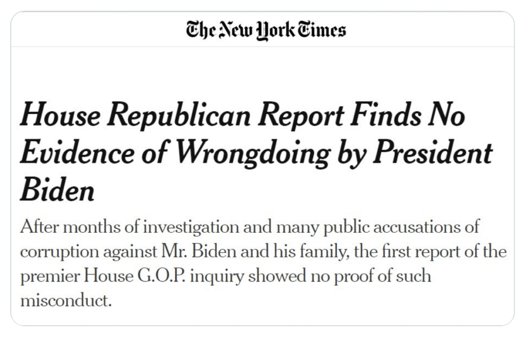 In fact, the committee outlined a ton of documentation in the form of bank records detailing exactly how gobs of money from foreign lands were washed and rinsed through a dozen shell companies and disbursed to everyone in the immediate Biden family down to the president’s grandchildren. The committee’s preliminary report was precise as to the money’s exact origins, its journey through the laundering apparatus, and the owners of the bank accounts it landed in. Thus: “No evidence of wrongdoing.”
