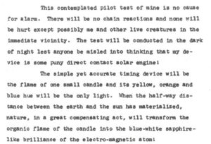 Prior to the interview with Nebel, Carr wrote a book called Dimensions of Mystery. The book was mostly written in ‘code.’ According to Carr it was the complete layout of his plan and how his machine worked. Yet for a reader like me, or anyone for that matter, it’s impossible to understand. He did switch from using code and poetry to actually writing real statements regarding his inventions for a public demonstration, as you can see below: