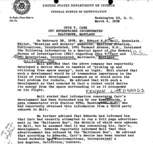 The idea that what Carr and his colleagues were doing could be some sort of “national security threat” pops up in this document. Carr was not only gaining interest from the FBI but also the Office of Naval Intelligence (ONI), The Air Force Office of Special Investigations (OSI) and The Technical Intelligence Field Agency, ACSI, a branch of the U.S. Army (as you can see in the document below).