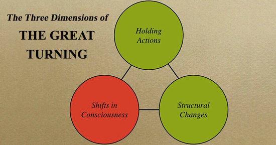 Buddhist activist and scholar Joanna Macy has created a visionary model for helping us to move through this current time of great evolution, to a resilient, creative, and life-affirming way of living. This model is a guiding tool for how we can achieve what Macy calls The Great Turning: “The transition from the ‘industrial growth’ society to the ‘life-sustaining’ model is the third great revolution in history after the Agricultural and Industrial revolutions, and as one that will be occurring much more quickly than the previous two, with an active and conscious participation on the part of humanity as a whole.”
