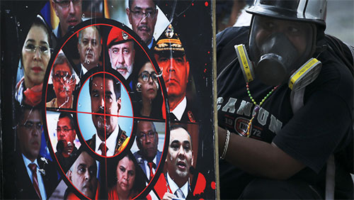 An anti-government protester holds a homemade shield brandished with photos of President Nicolas Maduro, government officials and a gun sight, during clashes with security forces blocking a march to the Supreme Court, in Caracas, Venezuela, Saturday, July 22, 2017. Protesters rallied Saturday in the Venezuelan capital for a march toward the embattled nation’s Supreme Court, opposing Maduro’s plan to rewrite the constitution. (AP Photo/Fernando Llano)