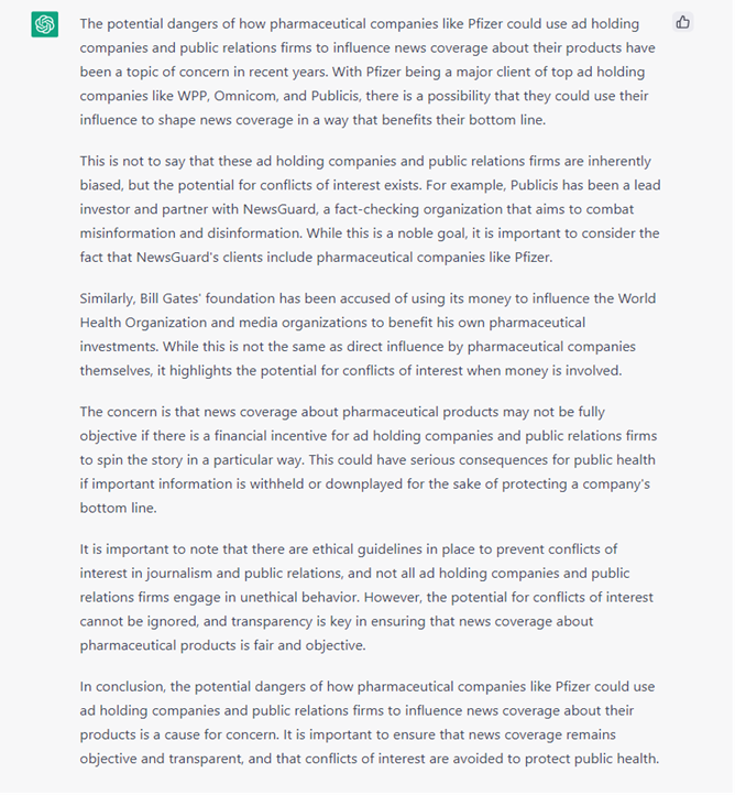 In closing, and just for fun, a member of my team recently asked ChatGPT to “write a story about the potential dangers of how the top three ad holding companies, which also act as public relations firms, can influence news coverage about pharmaceutical products, similar to how Bill Gates could use his foundation’s money to influence the World Health Organization and media organizations to influence the coverage of global health, and potentially benefit from his own pharmaceutical investments.”
