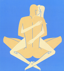 The man is sitting in the lotus posture (PADMASANA) or a variant of this posture for those who are at the beginning and cannot approach it. Holding his spine straight the man gets the woman in his arms while introducing his lingam in her yoni, and she sits on him holding him by the shoulders and crossing her legs around his torso, letting herself penetrated with voluptuousness. Due to this detail, this posture that the woman adopts is called “the action of the liana”: latasadhana. A highly sensuous woman, who loves her lover dearly and desires him with much love, can easily live the cervical-uterine orgasm in this posture, the most profound form of orgasm that can be experienced by a woman. The position of the erect lingam in this sexual posture allows it to penetrate right into the cervix, which leads to the experimenting of some exceptional orgasmic states in the two lovers. The woman will thus “swallow” the two extremities of the penis. Ejaculation can be successfully stopped in this way. The woman has an active role during the realization of this sexual position; she can balance her pelvis back and forth while she powerfully squeezes her lover’s lingam by contracting the vaginal muscles. In this posture, the sexual organs have a good contact, which allows the woman to be penetrated very deeply.