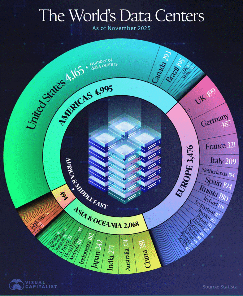 “Data centres are the backbone of the digital economy, storing, managing and processing the world’s data. In this graphic, we visualise the countries with the most data centres as of November 2025, revealing where the world’s digital infrastructure is concentrated,” Visual Capitalist said and produced the image below.