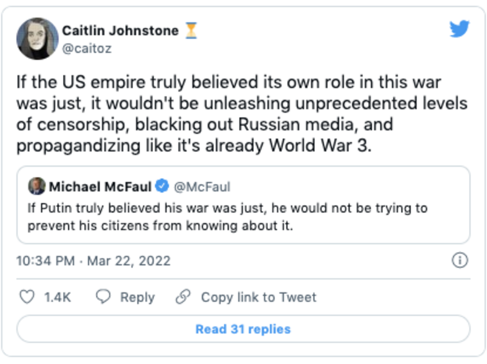 It seems like those who are new to the concept think that “propaganda” means making up fictional stories whole cloth, so they mistakenly assume that this is a claim that Russia never invaded and Ukrainians aren’t dying and suffering. But all it really means is that the narrative framing is manipulated. They’re not lying that there’s a war, they’re just manipulating the way people think about the war. How it’s happening, who’s to blame for it, whose agendas are served by getting it started and keeping it going, etc.