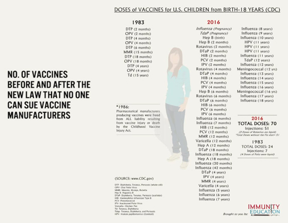 It’s probably not a coincidence that the schedule of vaccines went from seven injections and 24 doses in 1983 before this legislation was passed, to a whopping 51 injections of 70 doses by 2016.