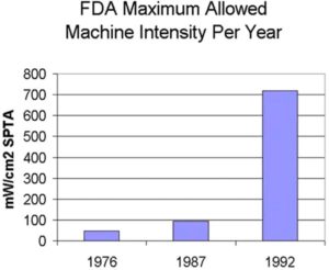 Unfortunately, as the technology evolved, higher doses were needed to get the higher quality images customers wanted, so in 1992, the FDA made the controversial decision to raise the permitted ultrasound limits massively.