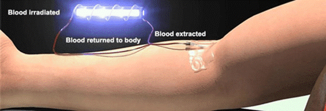 Classically, UVBI involves removing a small amount of blood (40 to 60ml), diluting it, and then infusing it back into the body while passing it through UV light.