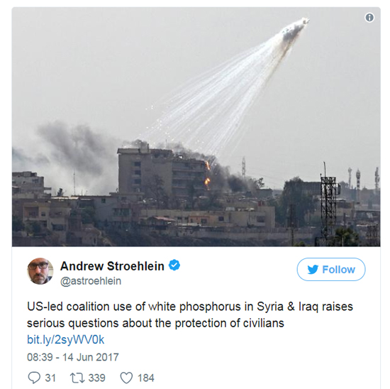 “No matter how white phosphorus is used, it poses a high risk of horrific and long-lasting harm in crowded cities like Raqqa and Mosul and any other areas with concentrations of civilians,” said Steve Goose, arms director at Human Rights Watch.
