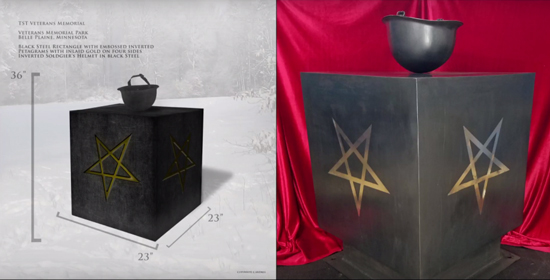 In May 2017, a Satanic monument was approved for display in a veterans memorial park, in Belle Plaine, Minnesota. The monument, a large black steel cube engraved with a golden inverted pentagram topped with an upturned soldier’s helmet, is the first such monument approved for display on public grounds in the U.S.