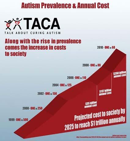 The graph below, taken from the Talk About Curing Autism website, explains the costs to society associated with Autism Prevalence. No longer can we accept the CDC’s/FDA’s religious-like-belief system in vaccines, especially that vaccines are ‘safe’ and don’t cause adverse health effects, when vaccine package inserts list a host of contraindications, adverse reactions and other unfavorable information, e.g., vaccines have not been tested for carcinogenicity, teratogenicity or causing infertility.