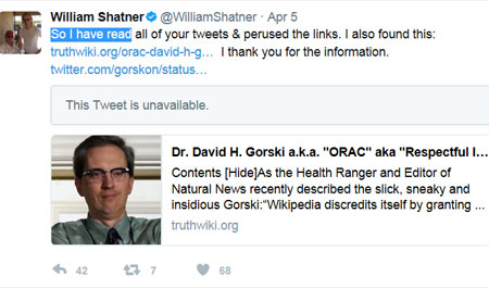 When Shatner tweeted the URL to TruthWiki.org, which exposes the astonishing history of deceit, distortions and abandonment of medical ethics by Dr. Gorski, he was roundly blasted by the coordinated efforts of the vaccine establishment, which incessantly seeks to silence all dissent: