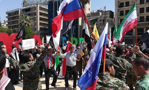 Syrian people flood into the streets waving Russia and Syria flags in celebration of defeat of Western aggression on April 14, 2018