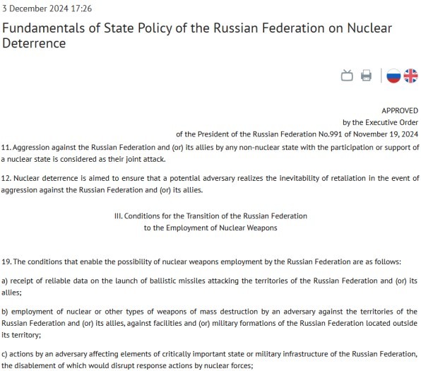 In Russian terms, this is a clear breach of the red line in the government’s nuclear warfighting and deterrence doctrine, issued last December, of Articles 11 and 19( c).