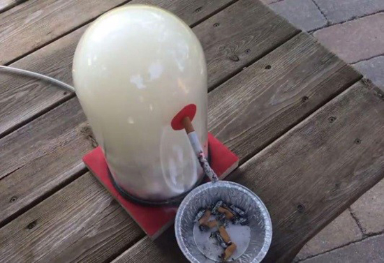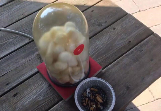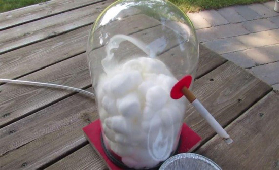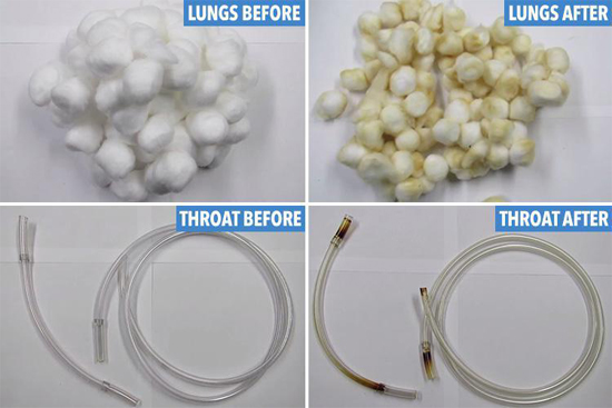 Chris fills a glass container with cotton balls and uses a suction pump to suck the smoke from cigarettes, which is then pulled through the jar. After 20 cigarettes are sucked through the container, the cotton balls reveal a sickly brown colour released by the toxic chemicals. He also shows a clip of the pump’s tube, which acts as the throat. It too is filled with a gooey brown tar.