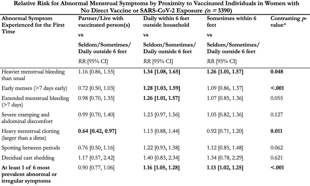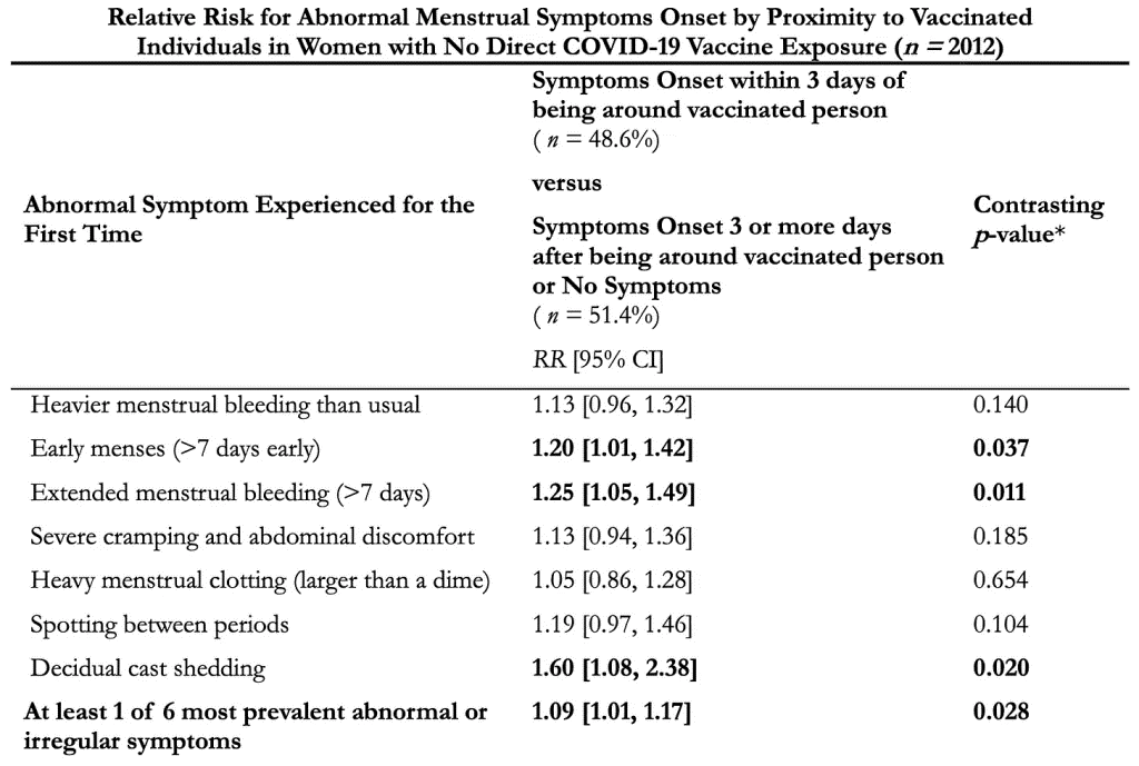 In addition to the reports compiled through virtual communication networks, MyCycleStory conducted an IRB approved study of 6049 female respondents (18 and older) which identified 3390 who had never had covid or a vaccine, and found 92.3% of them experienced menstrual abnormalities likely due to shedding which typically onset within 3 days of exposure: